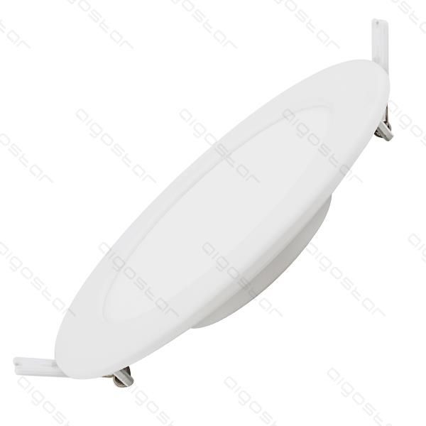 Inbouw downlight van kunststof met matte witte afwerking, voorzien van geïntegreerde 6W LED (3000K, 420 lm). De ronde lamp heeft een diameter van 110 mm, IP44-bescherming en werkt op 220–240 V AC.