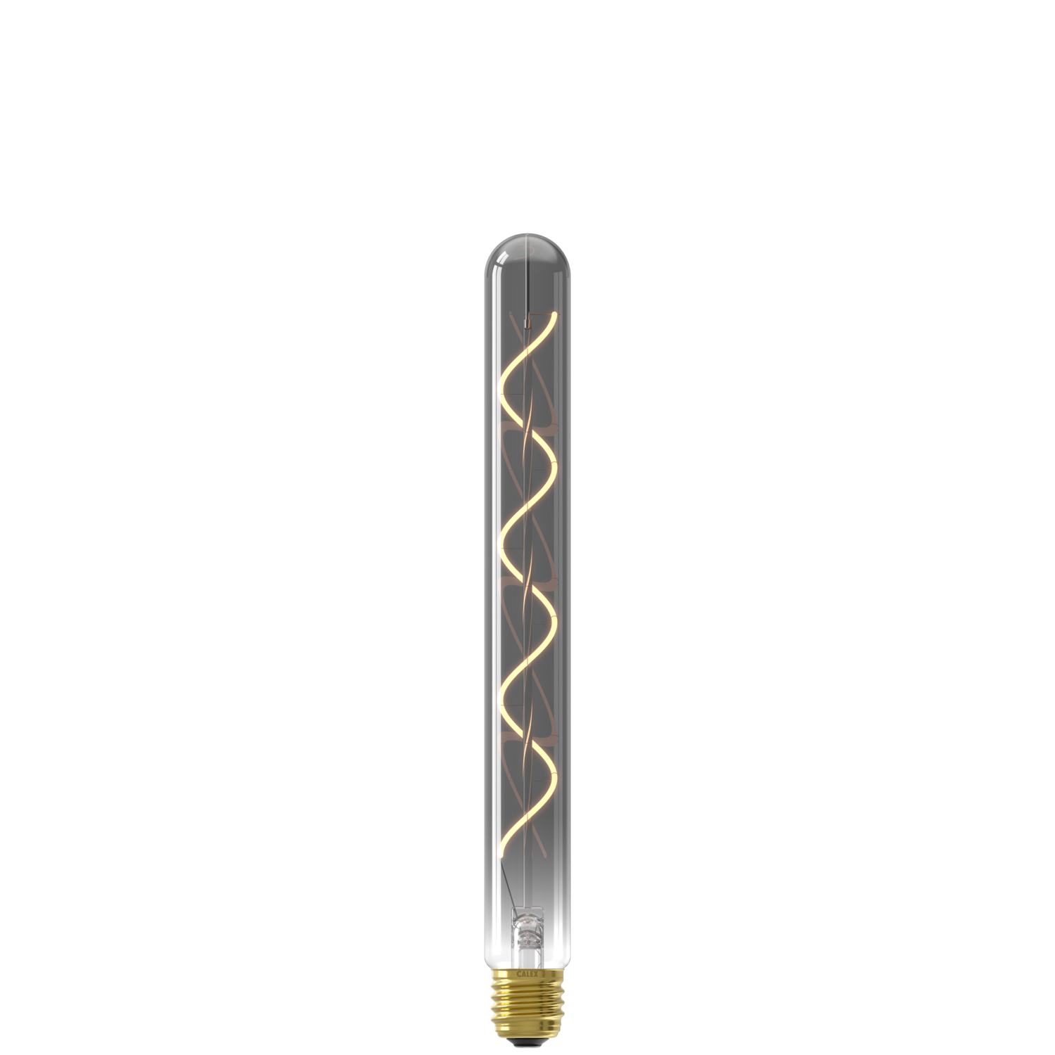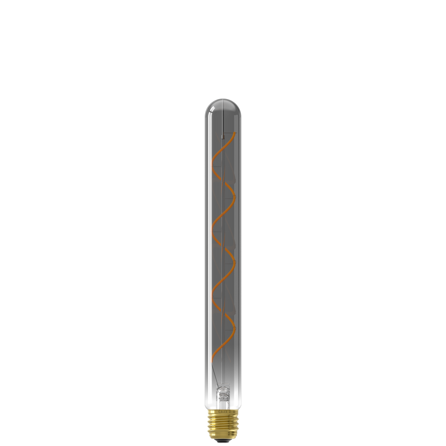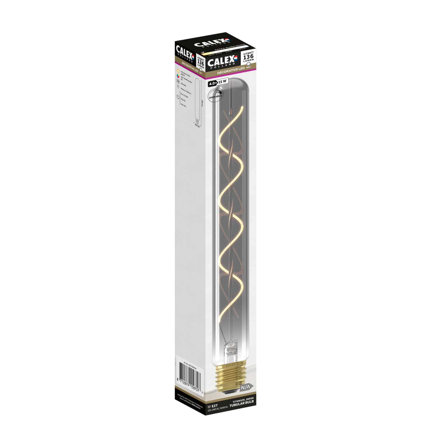 De Calex E27 Buislamp Titanium Flex 4W Flame combineert een stijlvolle uitstraling met warm, sfeervol licht. De langwerpige T32-vorm van 30 cm en het smoke-glas geven de lamp een moderne industriële look die goed past in open armaturen of als losse lichtbron. Dankzij de zichtbare spiraalvormige LED-filamenten ontstaat een zacht vlammend lichteffect met een kleurtemperatuur van 1800K.