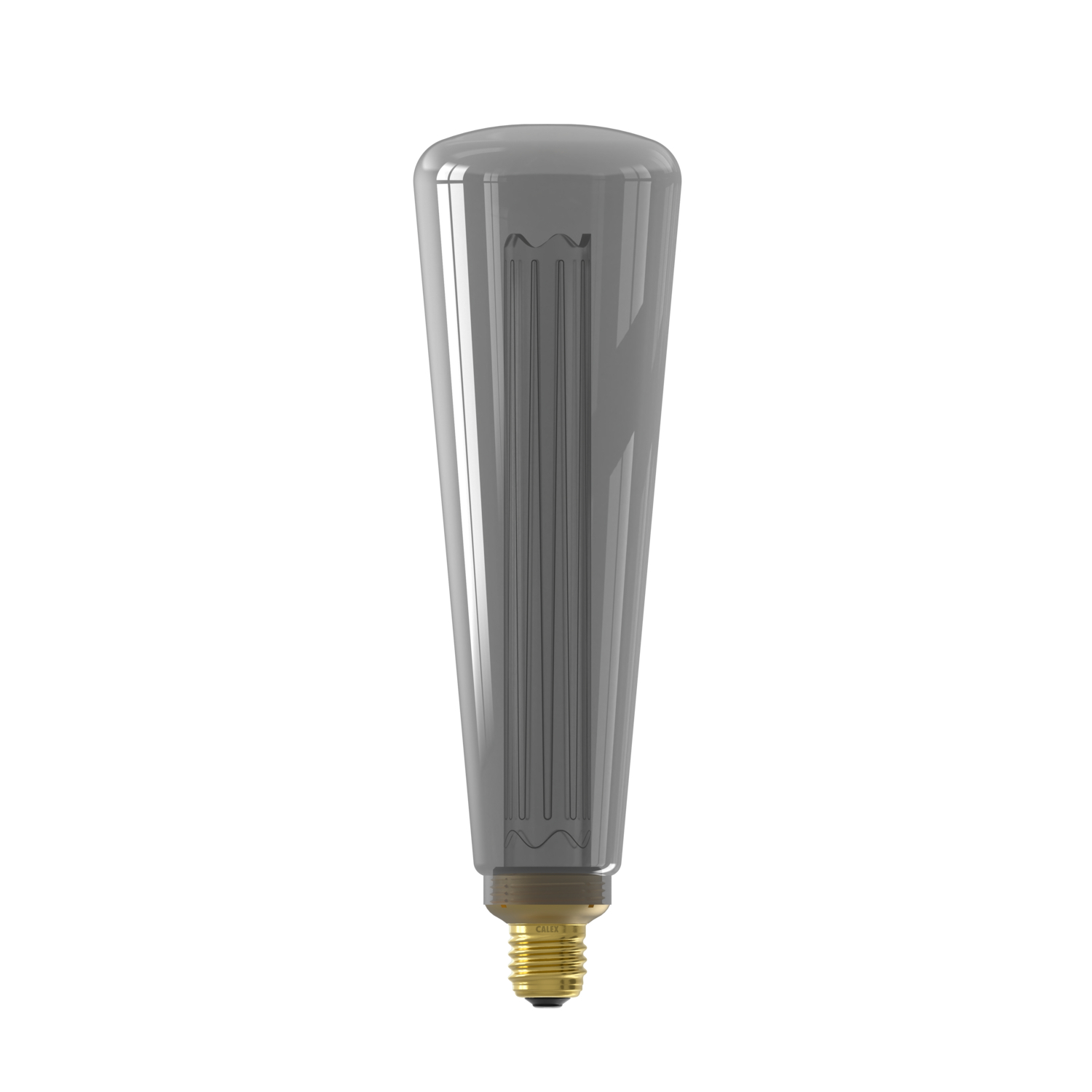 De Calex Royal Kinna E27 LED-lamp van 3,5 W geeft warm flame-licht van 2000 K en 60 lm. De glazen lamp met smoke-afwerking is 320 mm hoog, 120 mm breed en volledig dimbaar op 220–240 V.