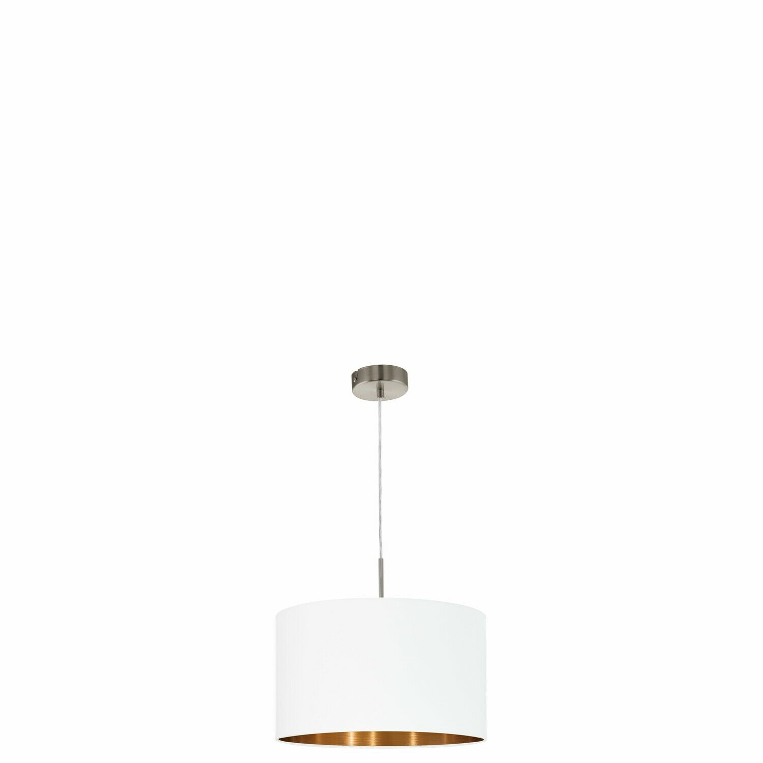 De Eglo PASTERI hanglamp is een ronde textielen lamp in wit met koperkleurige binnenzijde, Ø38 cm en hoogte 110 cm. Voorzien van één E27-fitting (max. 60 W), geschikt voor 220–240 V en bediening via wandschakelaar of dimmer.