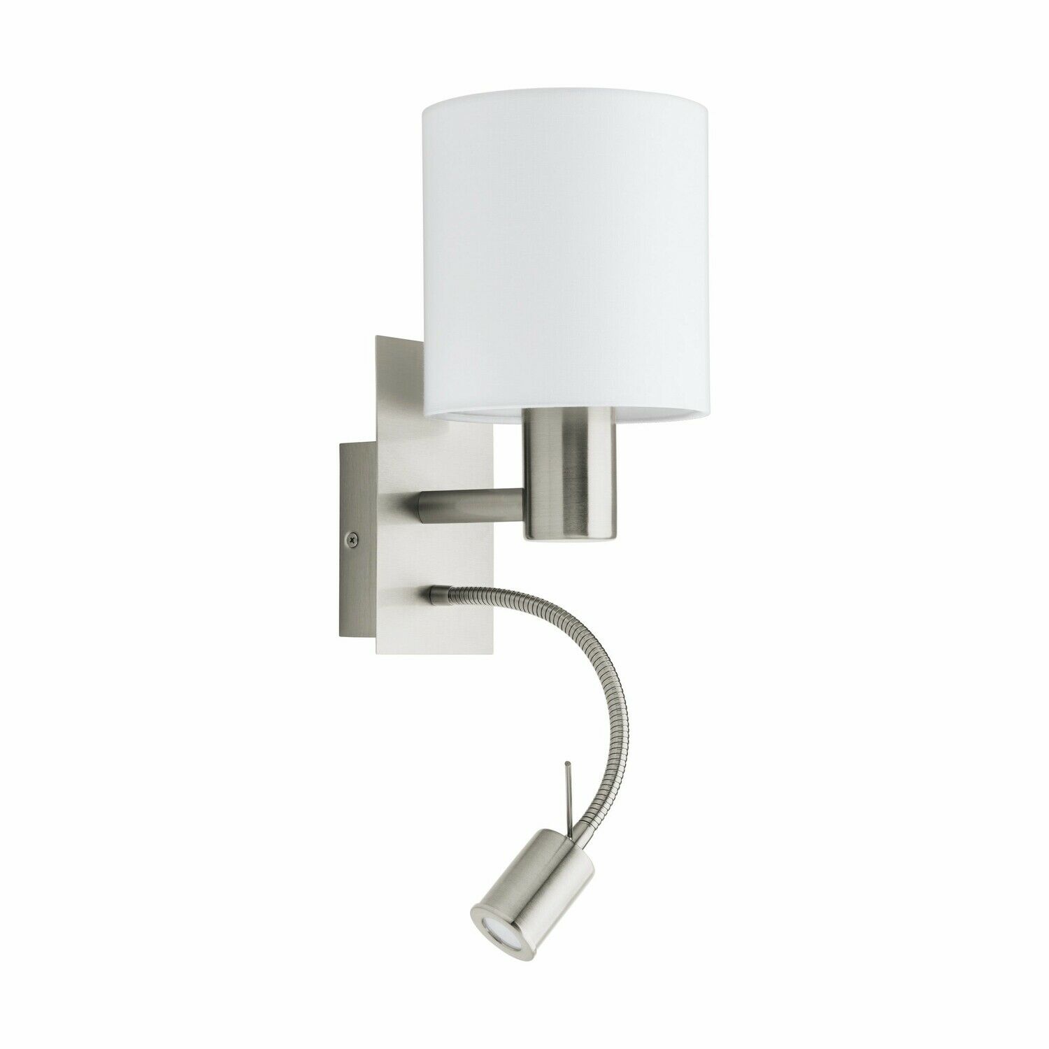De Eglo PASTERI wandlamp is een moderne opbouwlamp van metaal en wit textiel met twee lichtpunten. Voorzien van E27โfitting en flexibele LEDโlezer, geschikt voor 220โ240 V, afmetingen 150 ร 195 ร 380 mm.