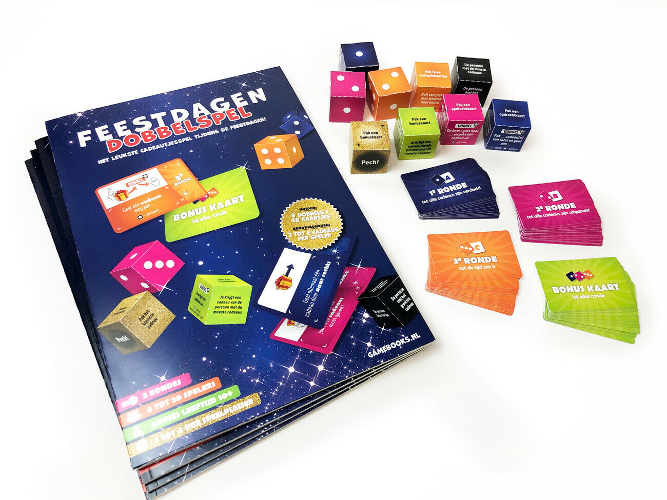 - Bevat dobbelstenen en opdrachtkaarten