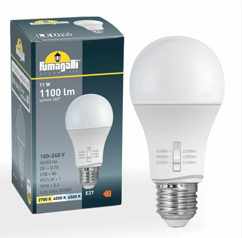 De Fumagalli E27 peerlamp van 11W levert 1100 lumen en heeft een opaal afwerking in A60-vorm. De lichtkleur is instelbaar tussen 2700K, 4000K en 6500K, met een levensduur van circa 25.000 uur.