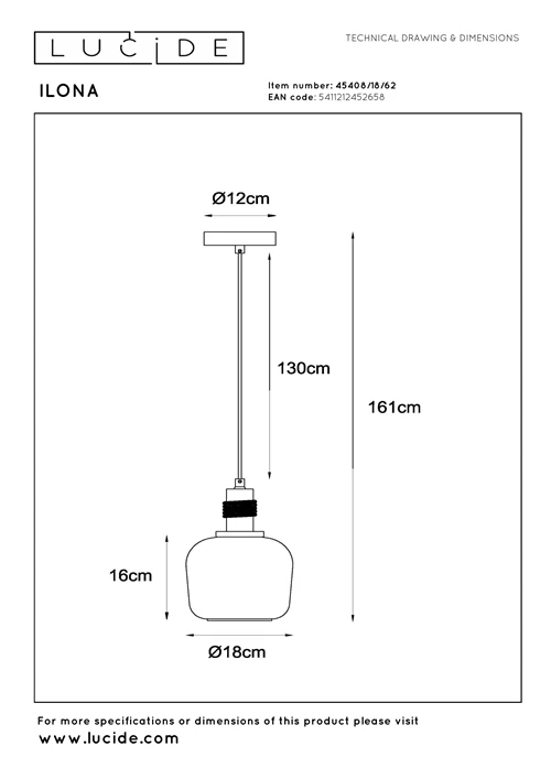 De lamp is in hoogte verstelbaar en wordt aangesloten op de netspanning (220–240V). Dankzij de E27-fitting kun je zelf een lichtbron kiezen tot maximaal 40 watt, eventueel dimbaar afhankelijk van de gekozen lamp. De Ilona is bedoeld voor binnengebruik (IP20) en wordt bediend via een wandschakelaar. Het glasoppervlak is eenvoudig schoon te houden met een droge doek.