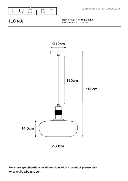 De lamp is in hoogte verstelbaar tot 162 cm en wordt opbouw gemonteerd aan het plafond. De ILONA is geschikt voor één E27-lichtbron (max. 40 W, niet inbegrepen) en kan, afhankelijk van de gekozen lamp, dimbaar worden gebruikt. De fitting is eenvoudig bereikbaar, waardoor het verwisselen van de lichtbron snel en veilig gaat.