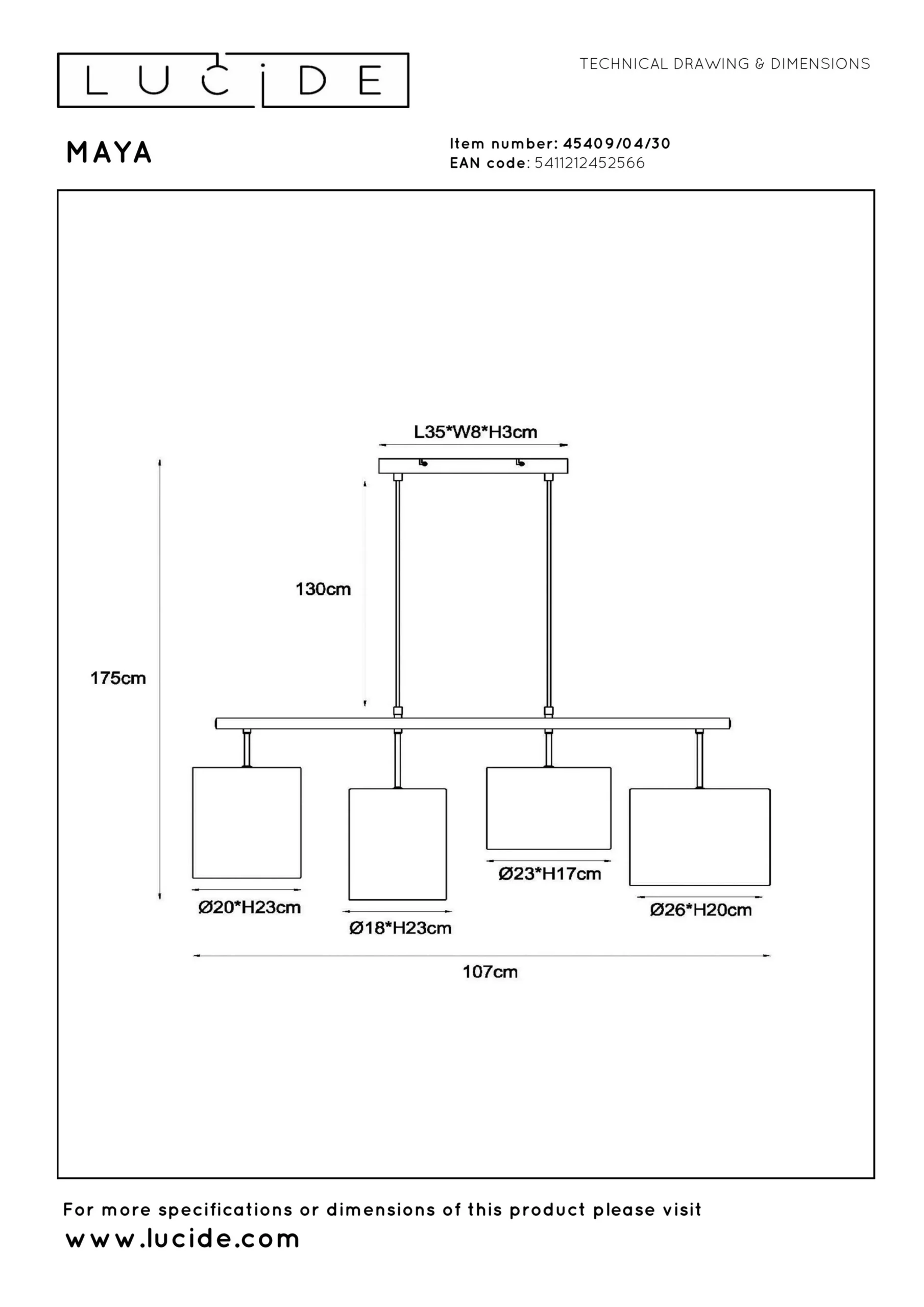 De hanglamp is geschikt voor vier E27-lichtbronnen van maximaal 40 watt en kan worden gedimd met een externe dimmer. De montage gebeurt via opbouw aan het plafond en de lamp wordt bediend met een wandschakelaar. Met een lengte van 107 cm en een breedte van 26 cm biedt de MAYA voldoende verlichting voor middelgrote tot grote ruimtes.