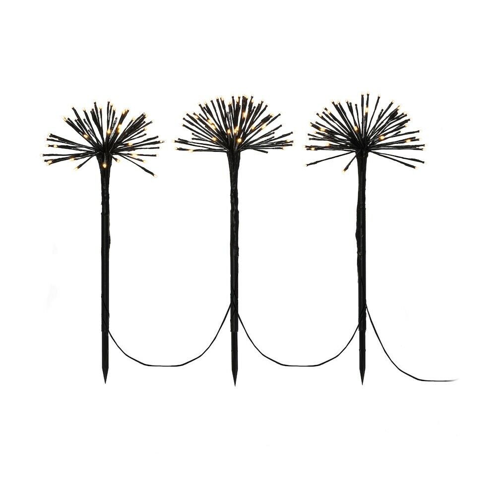 Set van drie zwarte kunststof prikspots voor buiten met in totaal 192 amberkleurige leds. De lampen hebben een hoogte van 50 cm, IP44-bescherming en een kabellengte van 12 m. Vermogen: 3,6 W.