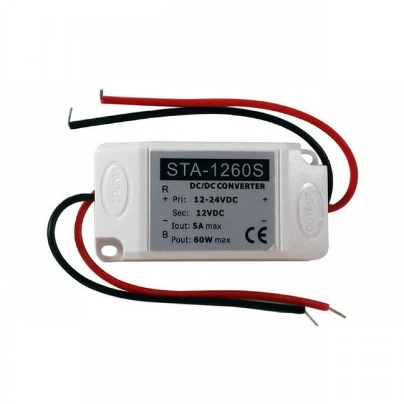 LED stabilisator voor constante 12V DC uitgangsspanning, geschikt voor maximaal 60 W en 5 A belasting. Uitgevoerd in compacte kunststof behuizing met IP20-bescherming, ideaal voor binnentoepassingen en stabiele LED-voedingen.