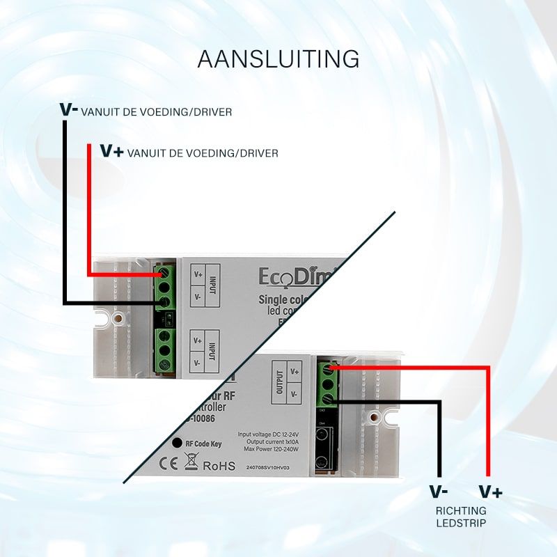 Deze led controller is eenvoudig aan te sluiten. De controller plaats je tussen de niet-dimbare driver (24V DC) en de 2700K led strip. Aan de input zijde plaats je de +draad vanaf de driver in de V+ poort en de -draad vanaf de driver in de V- poort. Vervolgens plaats je aan de output zijde de +draad van de led strip in de V+ poort en de -draad van de led strip in de V- poort. Let op dat je maximaal 240W op de controller aansluit. De afstandsbediening is nu eenvoudig te koppelen aan de led controller.
