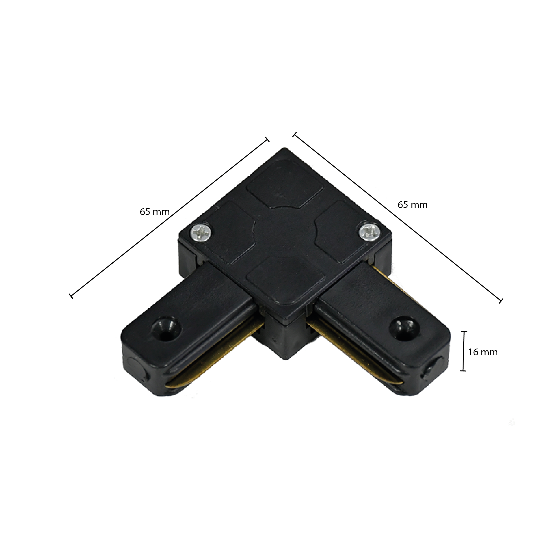 Het Ledl trackrail L‑vorm koppelstuk verbindt twee 1‑fase rails in een hoek van 90 graden. Gemaakt van zwart kunststof met metalen geleiders, afmetingen 65 × 65 × 16 mm, geschikt voor standaard 1‑fase railsystemen.