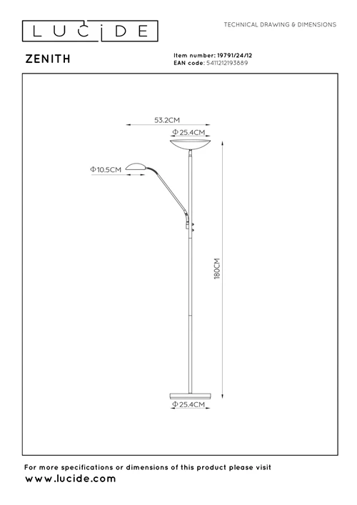 De Lucide ZENITH is een moderne vloerlamp van mat chroom met twee lichtpunten voor directe en indirecte verlichting. De lamp is dimbaar via een schakelaar op het armatuur en verspreidt warmwit licht van 3000 K.