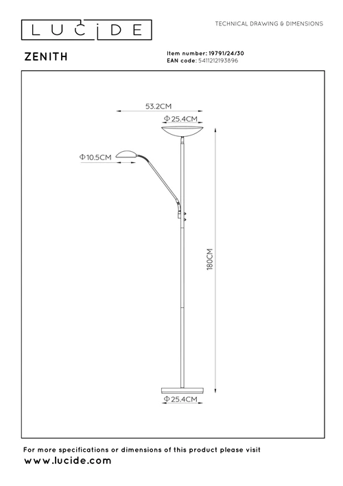 Met een hoogte van 180 cm en een stevige ronde voet blijft de lamp stabiel op zijn plaats. De geïntegreerde LED-lichtbronnen geven warmwit licht (3000K) met een totale lichtopbrengst van 400 lumen, ideaal voor woonkamer of slaapkamer. De leesarm is richtbaar, zodat je het licht precies kunt positioneren waar je het nodig hebt. De Zenith werkt op 220–240V en is geschikt voor gebruik binnenshuis (IP20).