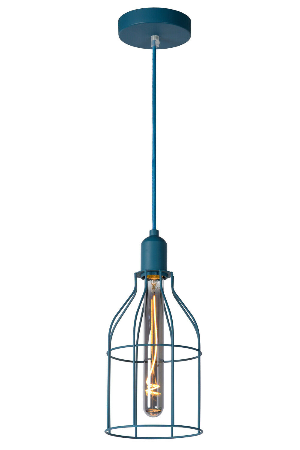 De Lucide POLA hanglamp combineert een speels ontwerp met een moderne uitstraling. De lamp is uitgevoerd in matblauw metaal en heeft een open draadframe dat zorgt voor een luchtig effect. Dankzij de ronde vorm en het compacte formaat van 15 cm diameter past deze lamp goed boven een kinderbed, bureau of in een gezellige hoek van de slaapkamer.