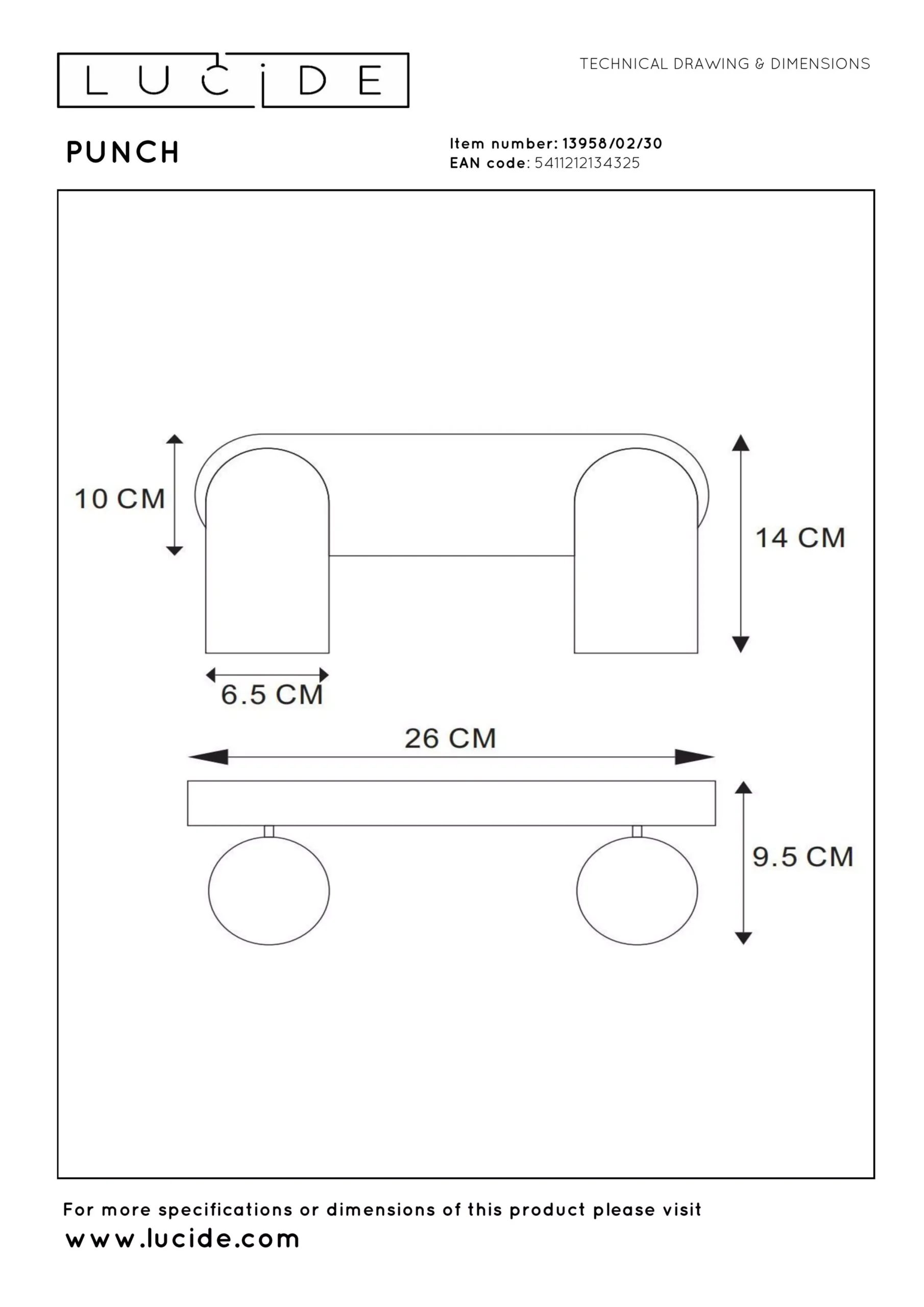 De Punch is voorzien van twee GU10-fittingen en werkt op 220–240V. De lichtbronnen zijn verwisselbaar en afzonderlijk dimbaar via een wandschakelaar (dimbare lampen vereist). Met een lengte van 26,5 cm, breedte van 14 cm en hoogte van 9,5 cm biedt deze plafondspot een compacte maar effectieve lichtoplossing voor binnenruimtes met IP20-bescherming.
