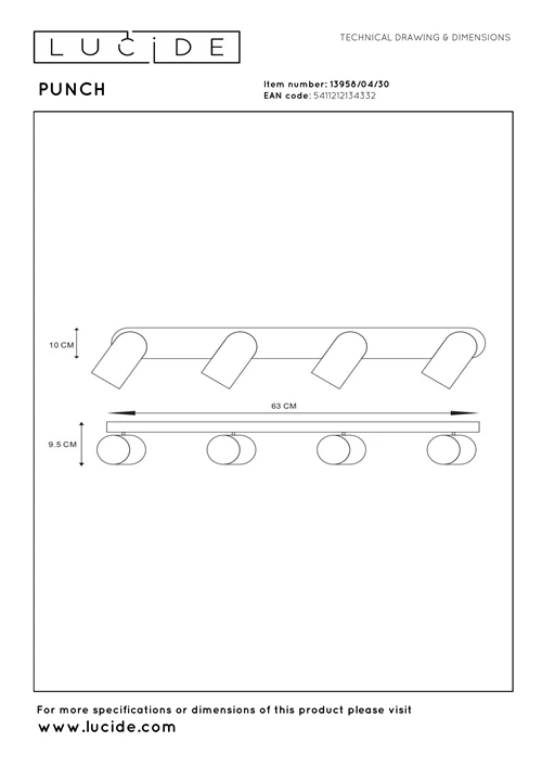 De Punch is ontworpen voor GU10-lichtbronnen (niet inbegrepen) en is geschikt voor aansluiting op 220–240V. De lamp is dimbaar in combinatie met een externe dimmer en wordt bediend via een wandschakelaar. Met een lengte van 63 cm, breedte van 10 cm en hoogte van 9,5 cm biedt deze plafondspot een evenwichtige lichtverdeling zonder de ruimte te overheersen.