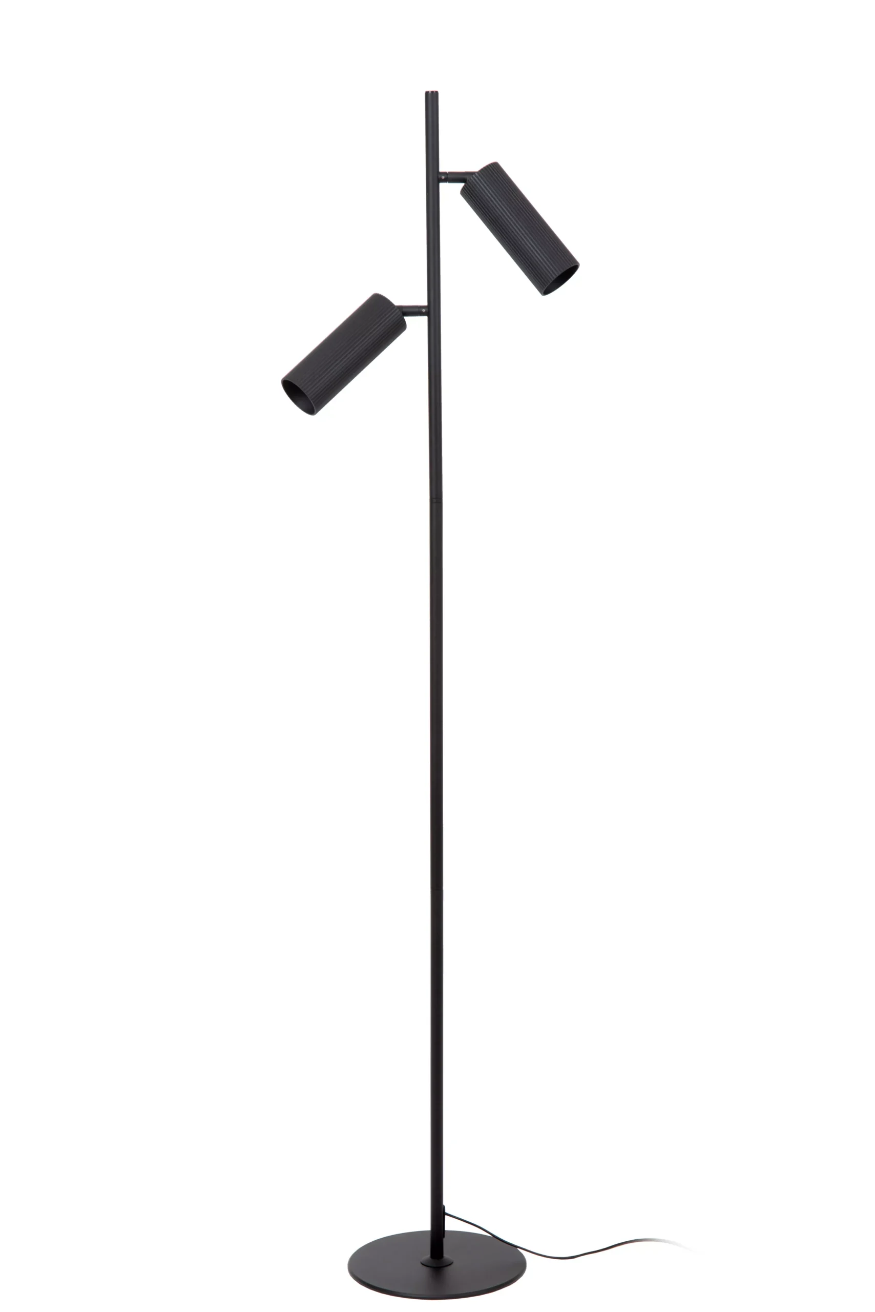 Moderne vloerlamp van zwart mat aluminium met twee verstelbare cilindervormige spots. Voorzien van GU10-fittingen, geschikt voor maximaal 40 W per lichtpunt. Hoogte 140 cm, bediening via schakelaar in het snoer.