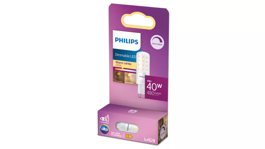 De Philips G9 Capsule 40W Warm Wit is een dimbare LED-lamp met G9-fitting, warmwitte lichtkleur van 2700K en lichtopbrengst van 480 lumen. De capsulevormige lamp (59 × 18 mm) heeft een heldere kunststof afwerking.