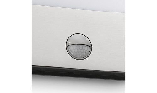 Wandlamp voor buitenverlichting met geïntegreerde 3 W LED-lichtbron (2700 K warmwit) en bewegingssensor. De zilverkleurige roestvrijstalen behuizing (162 × 75 × 228 mm) heeft IP44-bescherming en is geschikt voor moderne geveltoepassingen.