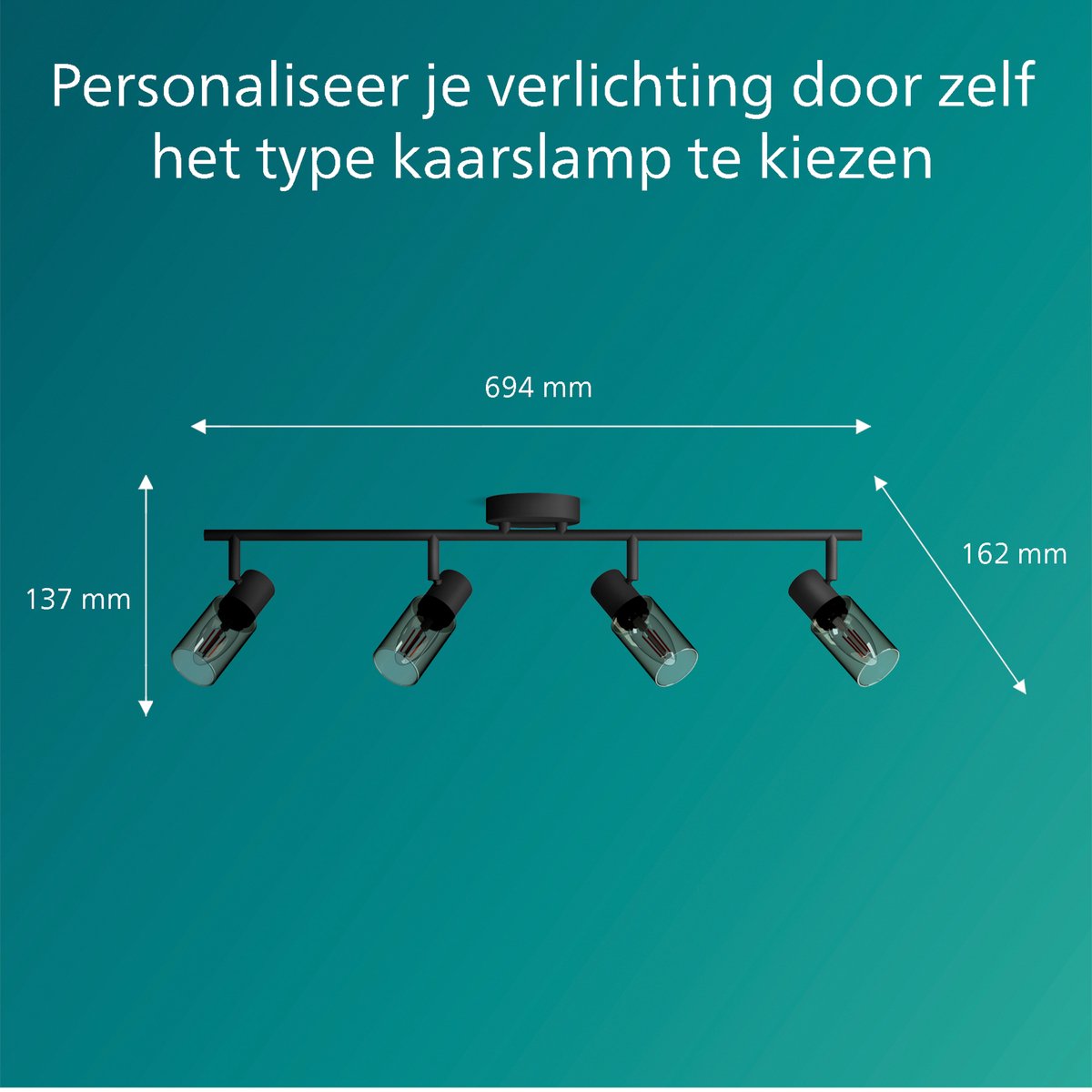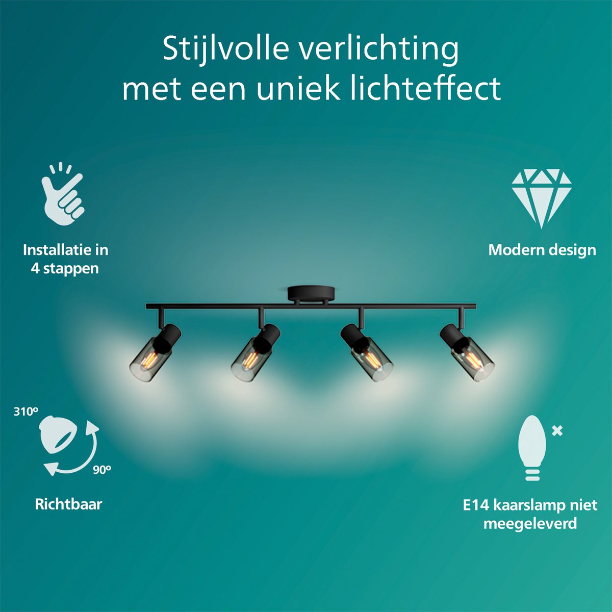 Bij de Philips PALMS Plafondspot 4 Lichts Zwart wordt een strak, minimalistisch zwart design gecombineerd met gerookt glas voor een uniek decoratief lichteffect. Je kan deze spots zelf alle kanten op richten