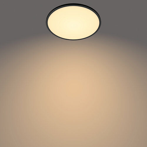De Philips Superslim plafondlamp is een moderne opbouwlamp van mat zwart metaal, Ø30 cm. Voorzien van geïntegreerde 18 W LED die warmwit licht (2700 K, 1500 lm) geeft en dimbaar is via SceneSwitch.