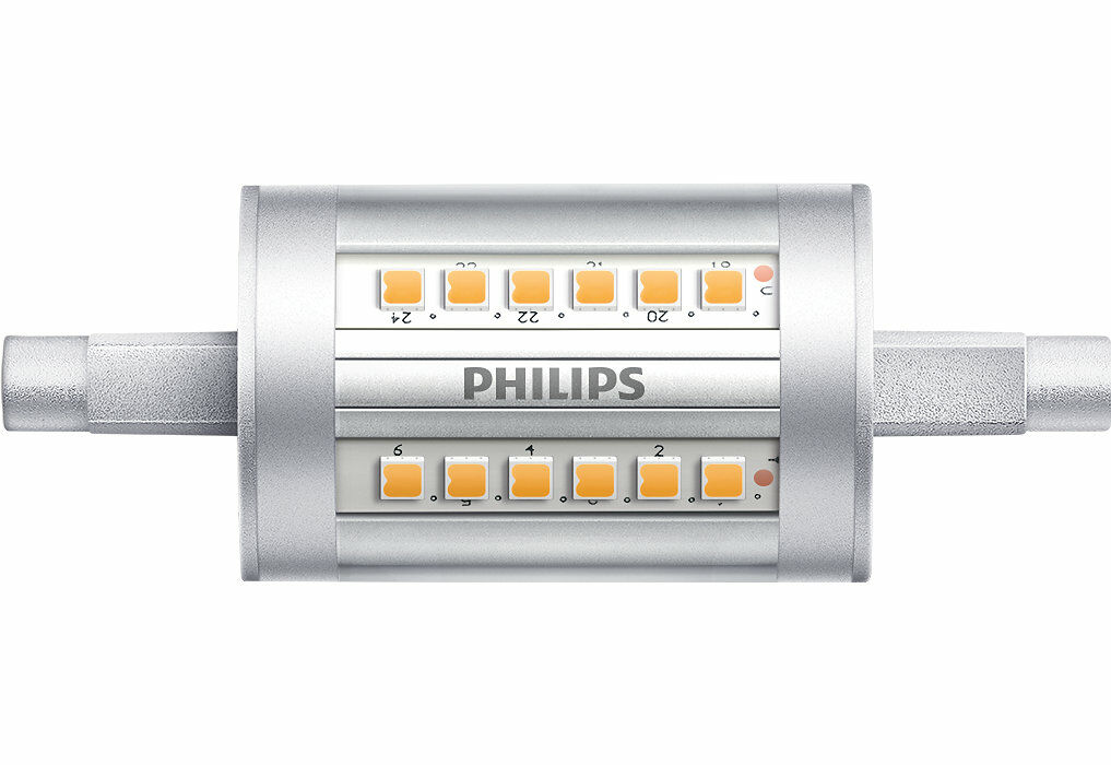 De Philips R7S staaflamp van 7,5 watt is een energiezuinige LED-vervanger voor traditionele halogeenstaaflampen van 60 watt. Met een lengte van 78 mm en een koelwitte lichtkleur van 4000K biedt deze lamp helder, neutraal licht dat ideaal is voor algemene verlichting in woonruimtes, werkplekken of buitenarmaturen met een R7S-fitting. De lichtopbrengst van 1000 lumen zorgt voor een gelijkmatige verlichting met een goede kleurweergave (CRI 80).