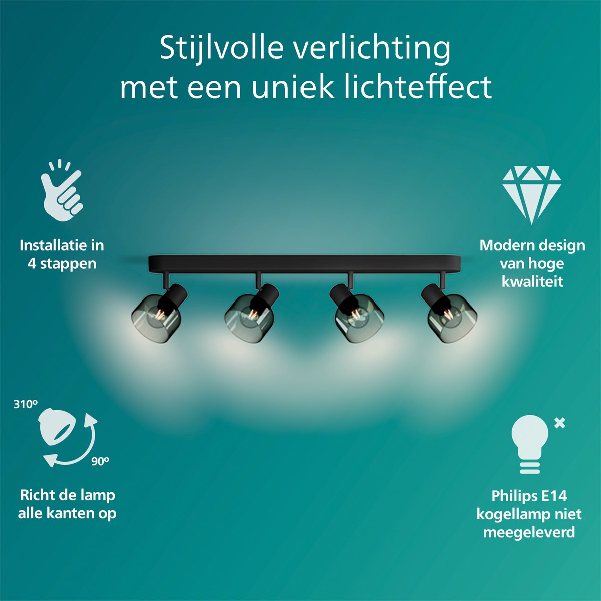 Ook geeft de E14 fitting ruime keuze aan het type lamp dat je wilt gebruiken; ga voor duurzaam en kies een Ultra Efficient lamp, kies voor meer sfeer met SceneSwitch technologie, of maak er slimme verlichting van met Philips Hue.