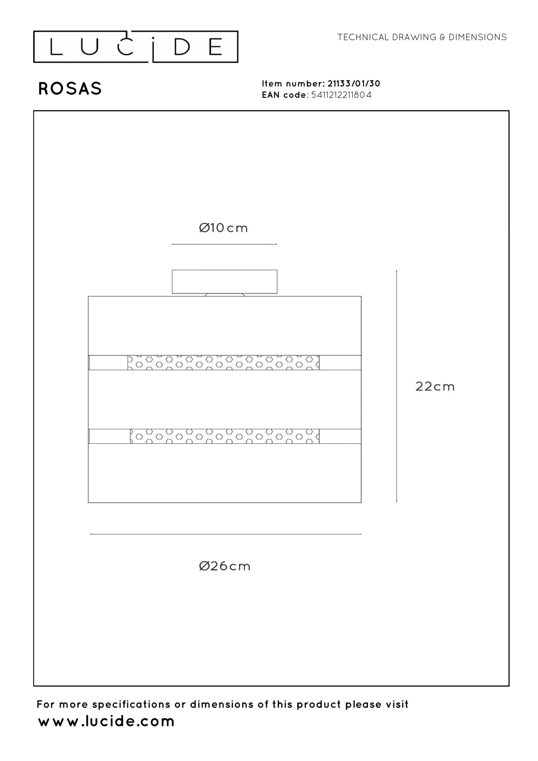 De Lucide ROSAS plafondlamp combineert een retro uitstraling met een moderne afwerking. De ronde metalen kap in matzwart is voorzien van geperforeerde messing details die het licht subtiel doorlaten en een warme gloed op het plafond creëren. Dankzij het compacte formaat van 26 cm diameter en 22 cm hoogte past deze lamp goed in diverse ruimtes, zoals de woonkamer, eetkamer of slaapkamer.