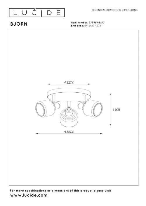 De lamp is ontworpen voor opbouwmontage en werkt op 220–240V netspanning. De drie E14-fittingen zijn geschikt voor lichtbronnen tot 40 watt per stuk en kunnen worden gedimd met een externe dimmer. De lichtbronnen zijn verwisselbaar, zodat je eenvoudig de gewenste sfeer kunt creëren. Met een IP20-classificatie is de BJORN bedoeld voor gebruik binnenshuis.