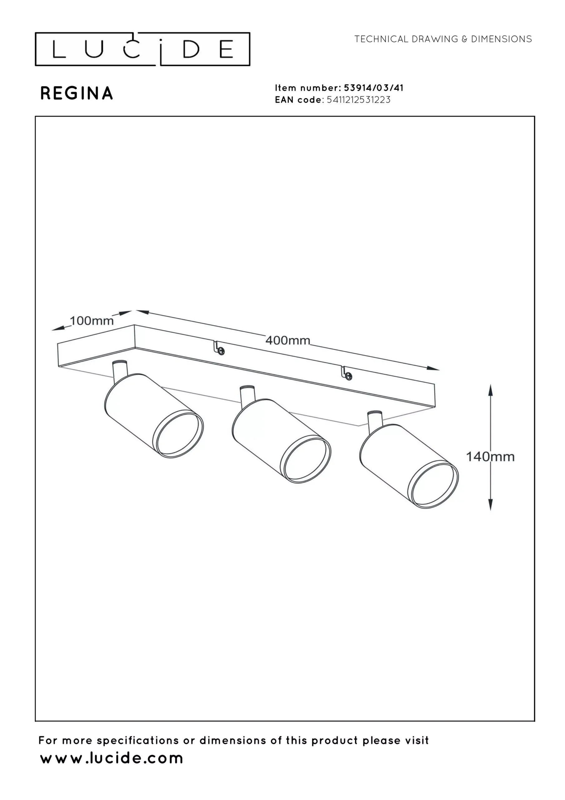 De lamp is voorzien van drie GU10-fittingen, geschikt voor verwisselbare lichtbronnen tot 50 watt. De spots zijn gericht naar beneden en werken op netspanning (220–240V). De REGINA is dimbaar in combinatie met een geschikte dimmer en wordt bediend via een wandschakelaar. Met een lengte van 400 mm, breedte van 100 mm en hoogte van 140 mm biedt deze plafondlamp een evenwichtige lichtverdeling zonder overdaad.