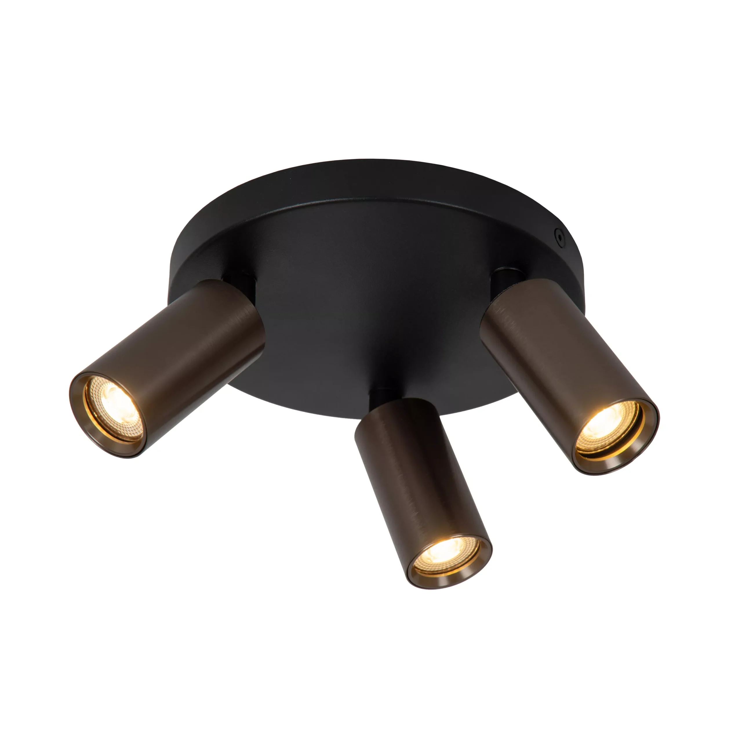 De Lucide RITMO plafondspot is een mat koffie opbouwspot van aluminium met drie verstelbare cilindervormige lichtpunten. De lamp meet 18 cm in diameter, gebruikt GU10-fittingen en werkt op 220–240 V.