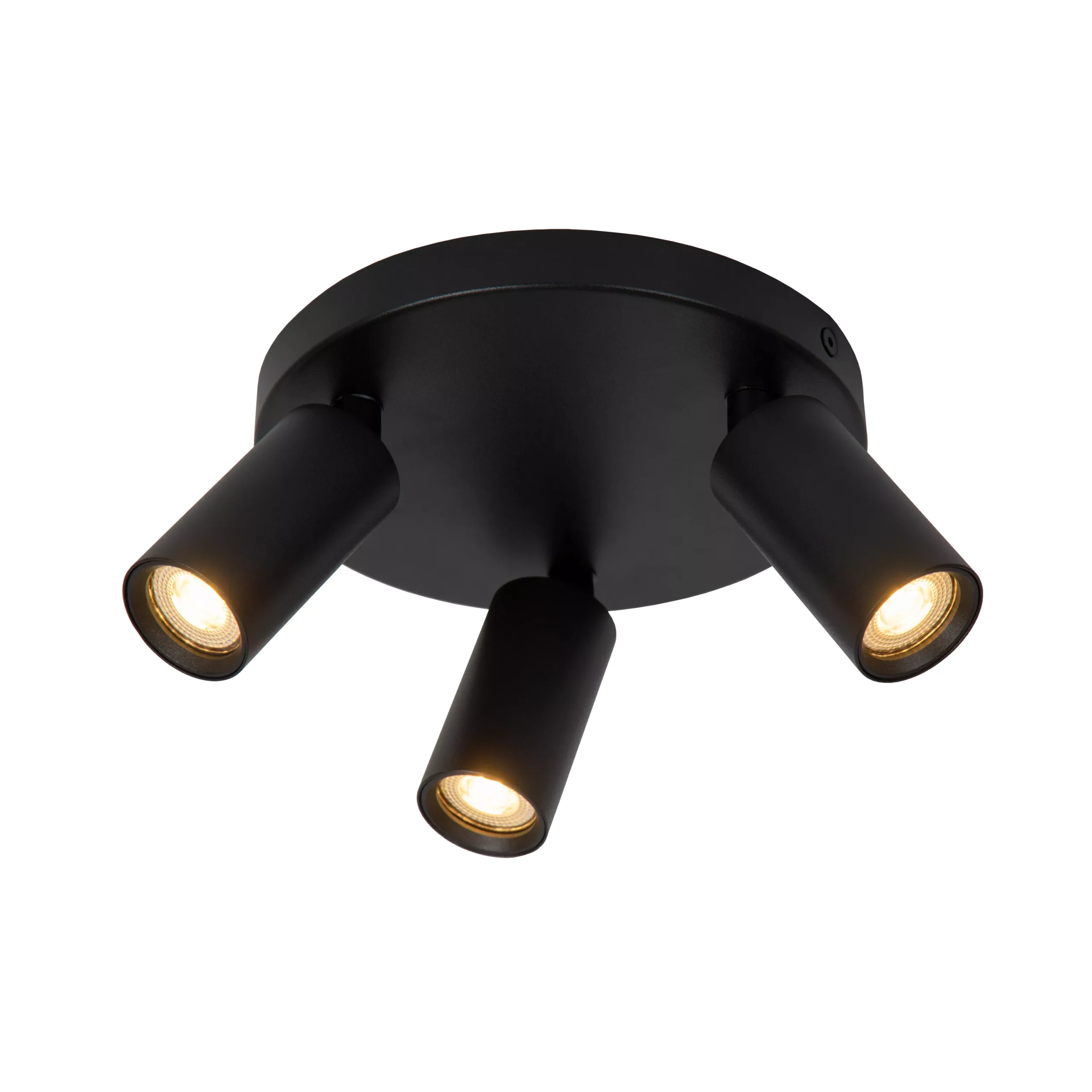 De Lucide RITMO plafondspot is een matzwarte opbouwspot van aluminium met drie verstelbare cilindervormige lichtpunten. De lamp meet 18 cm in diameter, gebruikt GU10-fittingen en werkt op 220–240 V.