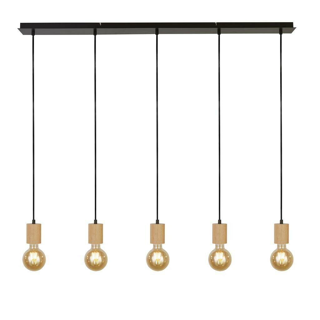 De Searchlight SPINNY pendel hanglamp combineert natuurlijke materialen met een strak ontwerp. De lamp bestaat uit een rechthoekige metalen plafondbalk in zwarte afwerking, waaraan vijf pendels met houten fittingen hangen. Dankzij de combinatie van hout en metaal past deze lamp goed in zowel moderne als klassieke interieurs. De hoogte is verstelbaar, zodat je de lamp eenvoudig kunt afstemmen op de ruimte, bijvoorbeeld boven een eettafel of kookeiland.