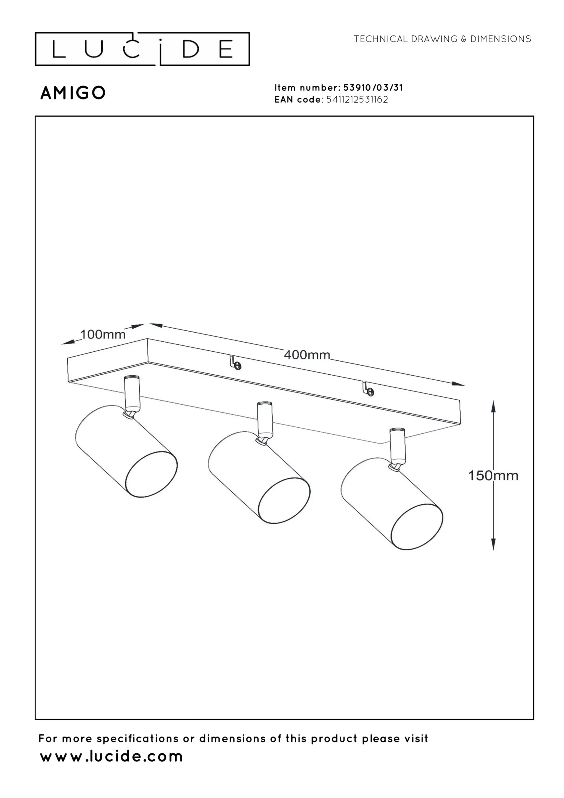De Amigo is voorzien van drie GU10-fittingen, geschikt voor verwisselbare lichtbronnen tot 40 watt per spot. De lamp werkt op 220–240V en kan worden bediend via een wandschakelaar. Met een IP20-classificatie is deze plafondspot bedoeld voor gebruik binnenshuis. De metalen behuizing is onderhoudsvriendelijk en eenvoudig schoon te houden met een droge doek.