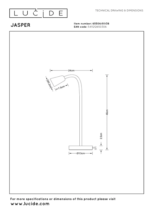De Jasper is voorzien van één lichtpunt met een GU10-fitting, geschikt voor een verwisselbare lichtbron tot 25 watt. De lamp werkt op 220–240V en is afhankelijk van de gekozen lichtbron dimbaar. De aan/uit-schakelaar bevindt zich in het snoer van 1,5 meter, wat zorgt voor eenvoudig gebruik. Met een IP20-classificatie is deze tafellamp ideaal voor gebruik binnenshuis, bijvoorbeeld in de woonkamer, slaapkamer of op kantoor.