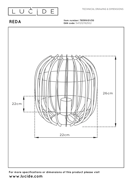 De lamp is voorzien van een E27-fitting en geschikt voor een lichtbron tot 40 watt (niet inbegrepen). De aan/uit-schakelaar bevindt zich in het snoer van 1,3 meter, wat zorgt voor eenvoudig gebruik. Met beschermingsklasse II en IP20 is de REDA bedoeld voor gebruik binnenshuis, in ruimtes zoals de woonkamer, slaapkamer of eetkamer.