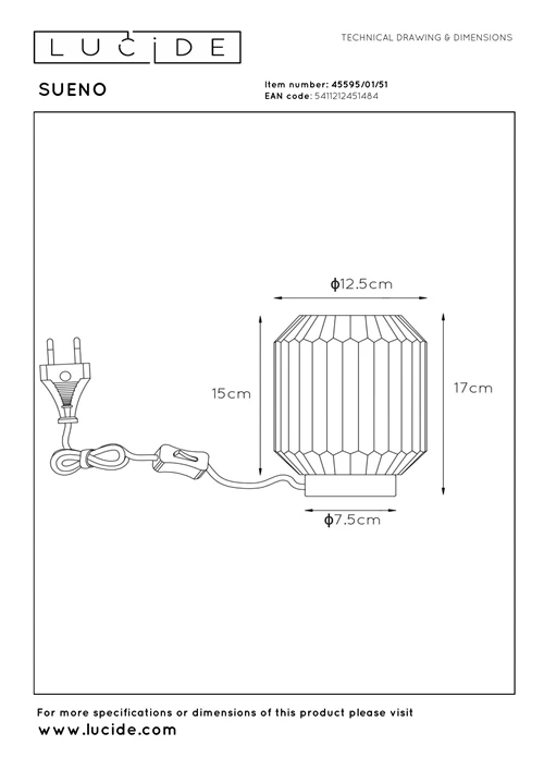 Met een diameter van 13 cm en een hoogte van 17 cm is deze compacte lamp eenvoudig te plaatsen op een bijzettafel, dressoir of nachtkastje. De Sueno is voorzien van een aan/uit-schakelaar in het snoer en werkt op netspanning (220–240V). De fitting is geschikt voor een E14-lichtbron tot maximaal 40 watt, die eenvoudig te vervangen is. Dankzij de IP20-classificatie is de lamp bedoeld voor gebruik binnenshuis.