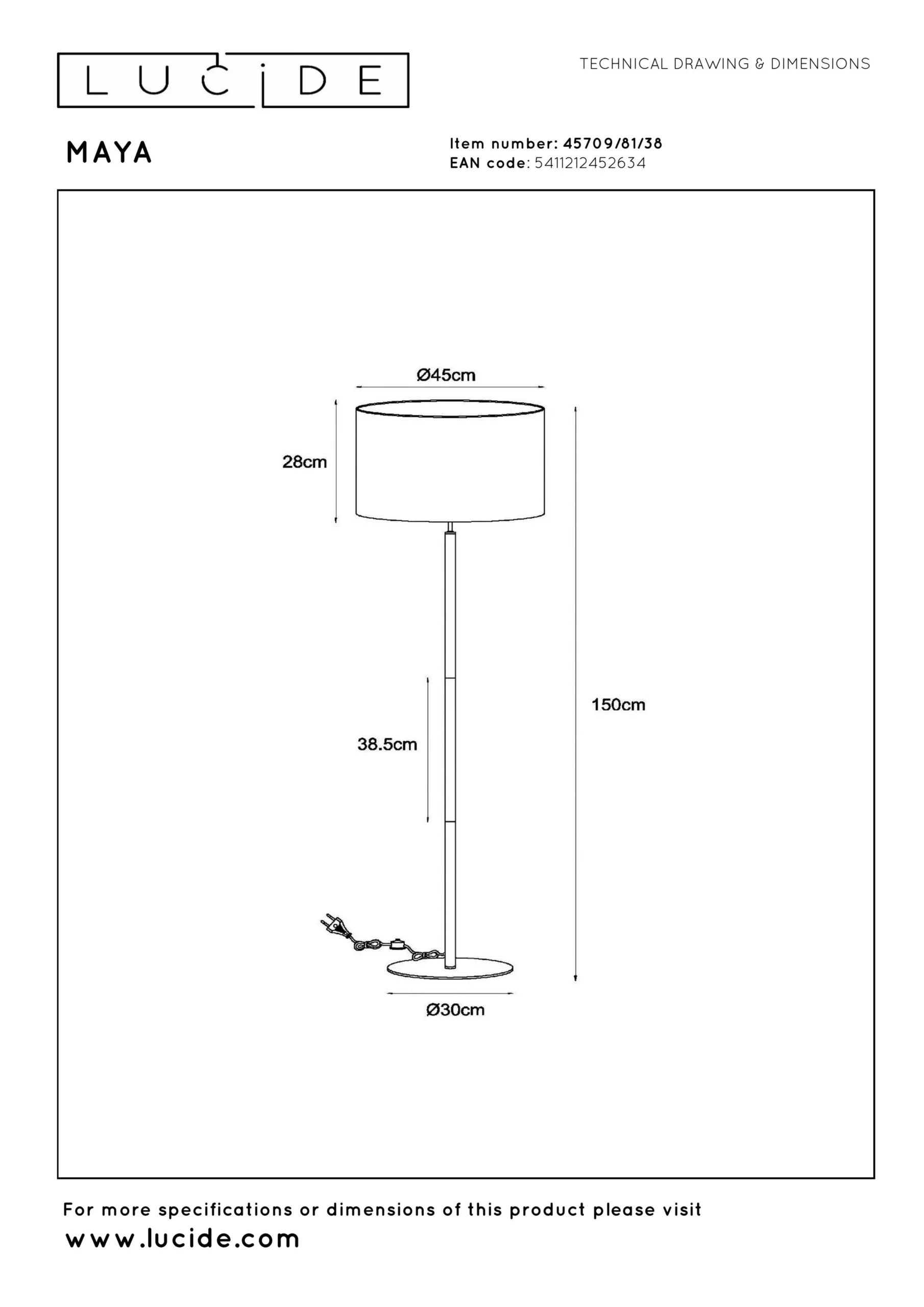 Met een hoogte van 150 cm en een kapdiameter van 45 cm heeft de vloerlamp een uitgebalanceerde proportie. De lamp is voorzien van een E27-fitting en geschikt voor een lichtbron tot 40 watt (niet inbegrepen). De aan/uit-schakelaar bevindt zich in het snoer van 2 meter, wat zorgt voor gebruiksgemak bij plaatsing naast een bank of fauteuil. De Lucide MAYA is bedoeld voor gebruik binnenshuis (IP20) en is niet dimbaar.