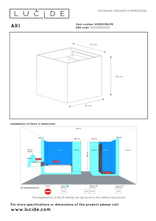 De Lucide AXI wandlamp combineert een strak design met functioneel licht. De kubusvormige lamp is uitgevoerd in zwart metaal en verspreidt warmwit licht (2700K) zowel omhoog als omlaag. Dankzij de IP54-beschermingsgraad is deze lamp geschikt voor zowel binnenruimtes zoals badkamer, keuken of woonkamer, als voor beschutte buitenplaatsen. De geïntegreerde LED-lichtbron van 7 watt levert 320 lumen en zorgt voor een aangename, sfeervolle verlichting.