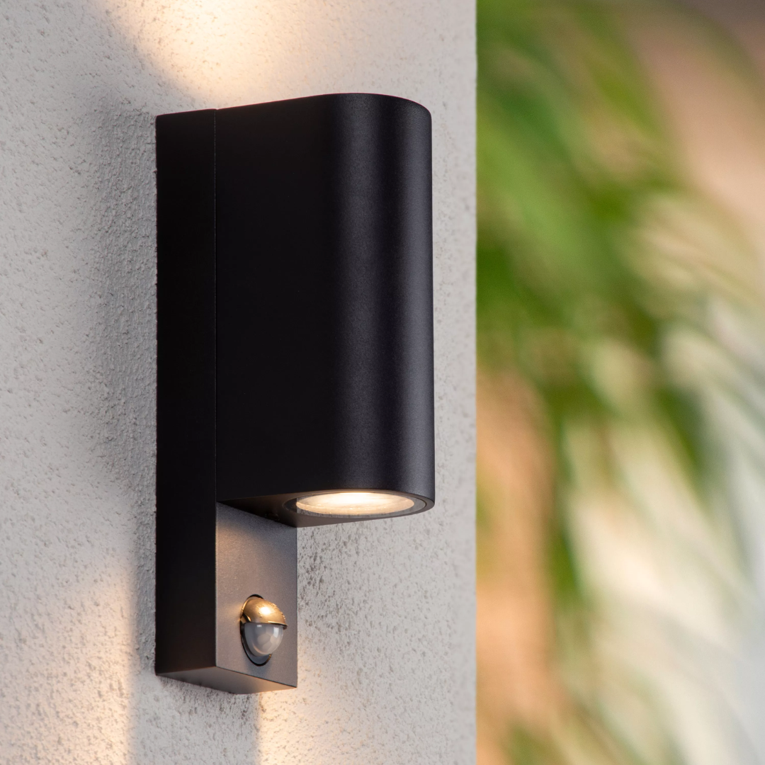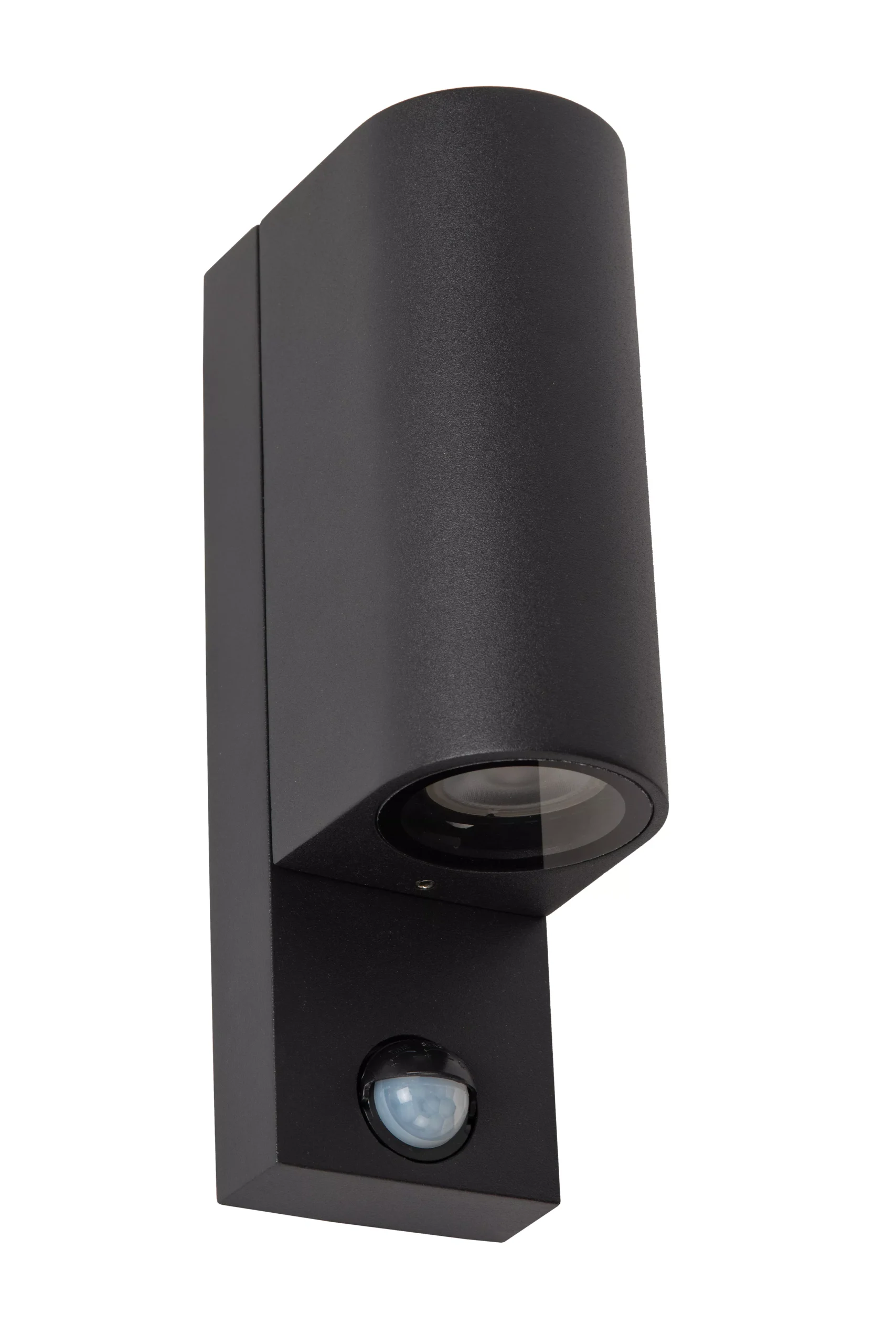 Wandlamp voor buiten met op- en neerwaartse lichtbundel, gemaakt van mat zwart aluminium. Voorzien van twee GU10-fittingen (max. 7 W) en PIR-bewegingssensor. Afmetingen: 230 × 104 × 70 mm, IP65 spatwaterdicht.