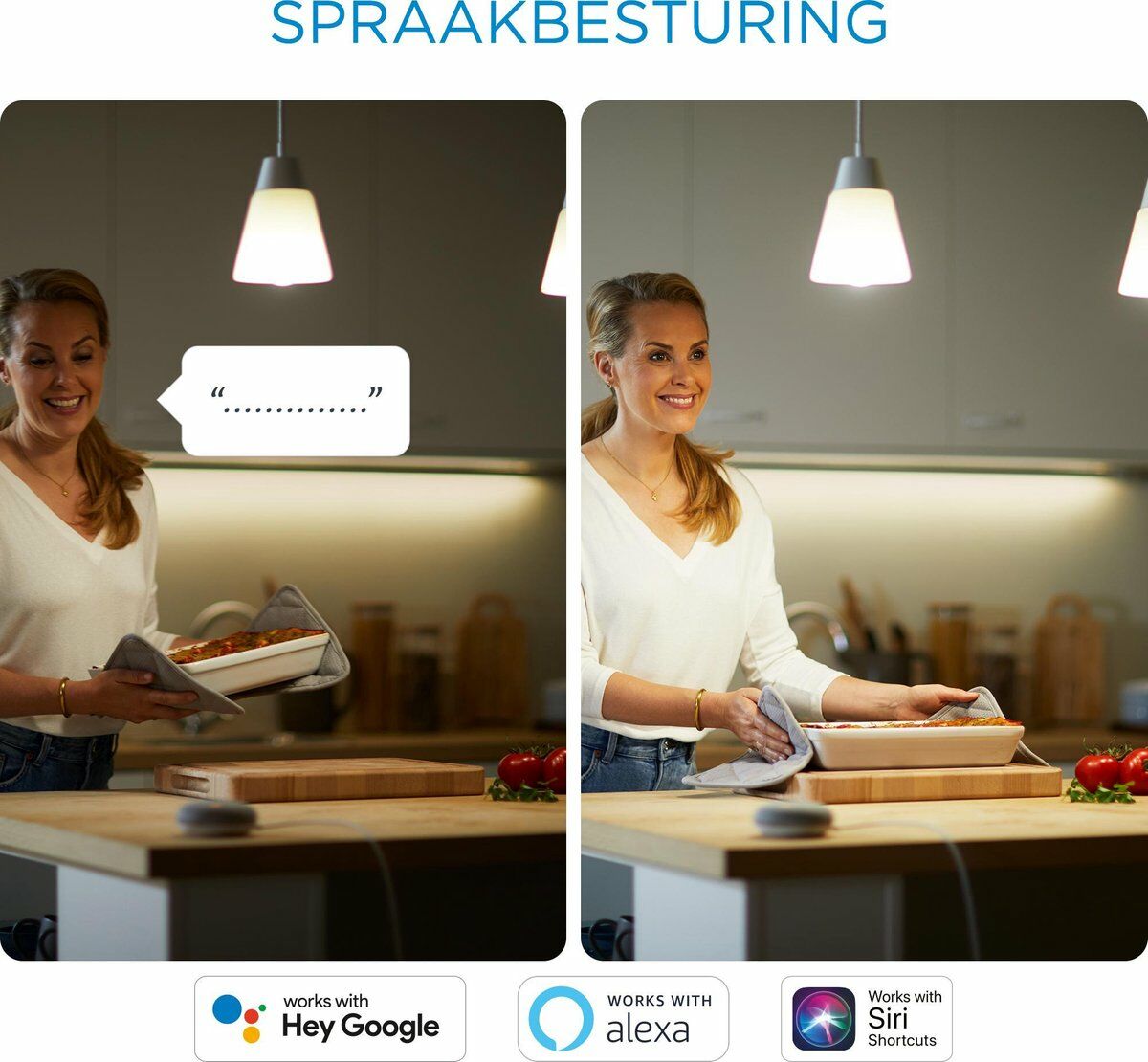 Deze slimme, peervormige, WiZ LED-lamp met instelbaar wit licht maakt het dagelijks leven gemakkelijker. Stel verschillende tinten warmwit tot koelwit licht in die je helpen te ontspannen of juist te concentreren. Je kunt timers instellen die je lampen automatisch in- of uitschakelen, gebaseerd op jouw dagritme. Bijvoorbeeld helder wit licht in de ochtend en zacht warm licht in de avond. Je kunt ze bedienen met je smartphone of stem, zelfs als je niet thuis bent. WiZ lampen werken rechtstreeks vanuit de doos, op je eigen wifinetwerk. Deze lamp heeft een E27-fitting, en past dus in de meeste lampen met grote fitting.