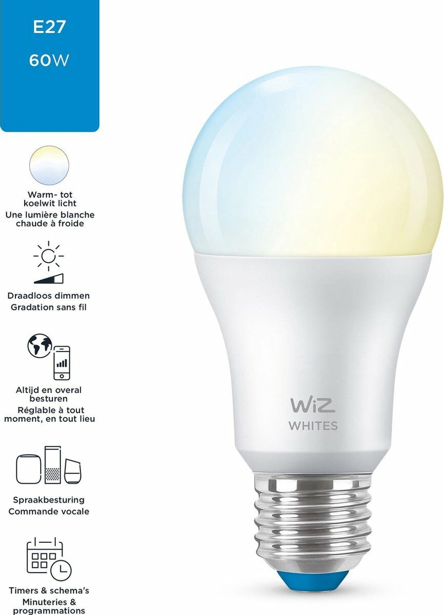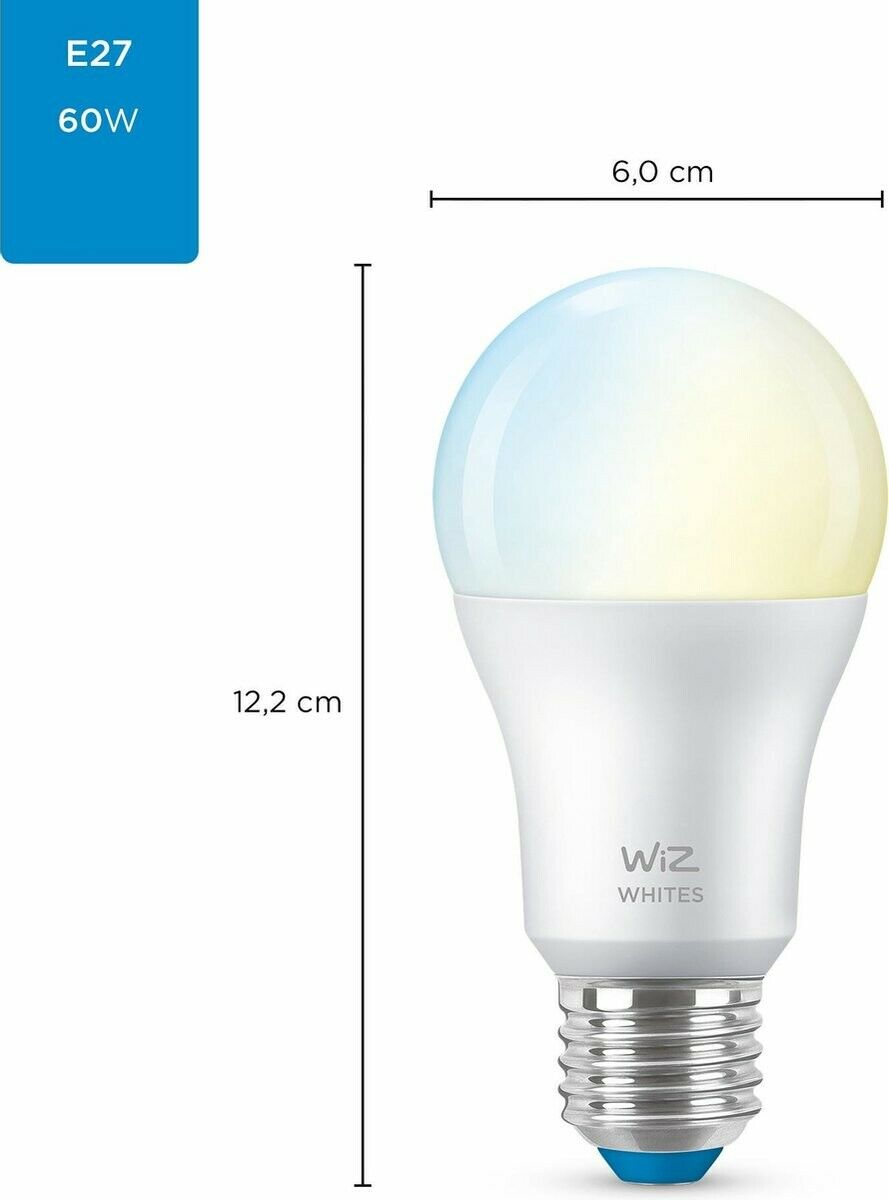 De WiZ E27 slimme LED-lamp van 8,5 W biedt instelbaar wit licht van 2700 K tot 6500 K, met een lichtopbrengst van 806 lumen. De lamp meet 12,2 ร 6 cm en werkt via WiโFi zonder hub.