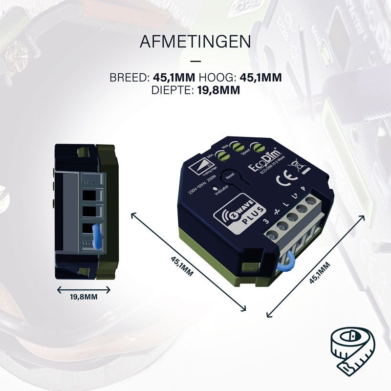 De Z-Wave dimmer inbouw heeft een inbouwdiepte van slechts 19,8mm. Hiermee past de module in iedere normale inbouwdoos. Let erop dat wanneer je de dimmermodule onder een pulsschakelaar installeert, je tevens op de inbouwdiepte van de pulsschakelaar let. Dit is van belang om te weten of de totale set in een U40 of U50 inbouwdoos past.