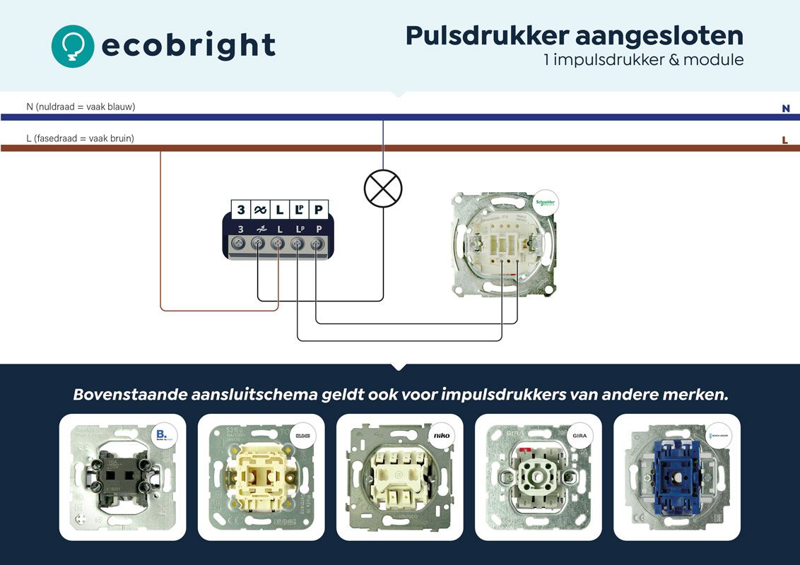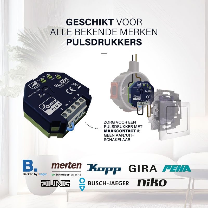 De dimmer module is passend onder ieder merk pulsdrukker. Let erop dat dit wel echt een pulsdrukker (met maakcontact) is, en geen aan/uitschakelaar. Het enige waar je verder op moet letten is de inbouwdiepte van de pulsdrukker, zodat je weet of het totaalplaatje (pulsdrukker + dimmer module 19.8mm) in jouw inbouwdoos past.