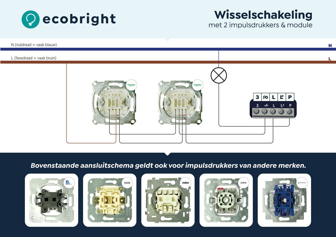 Geschikt voor wissel/hotelschakeling met pulsdrukker of draadloze wandschakelaar